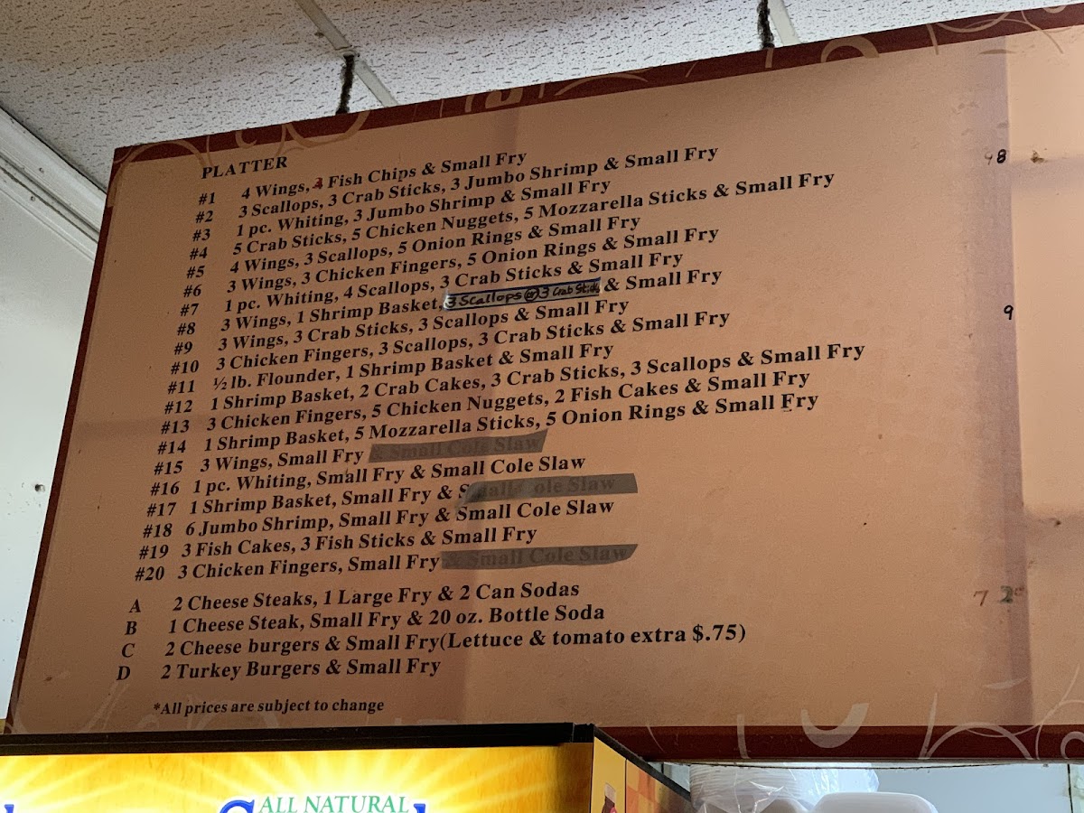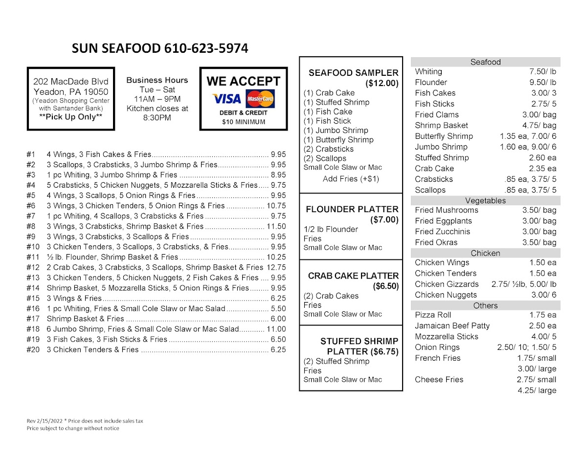 The menu at Sun Seafood offers a straightforward selection of casual, comforting bites that blend classic seafood favorites with familiar fried snacks. You’ll find a variety of platters combining wings, fish, scallops, crab sticks, and fries—perfect for a quick lunch or an easy dinner with friends and family. Alongside these, simple sides like mozzarella sticks, onion rings, and cheese fries complement the main dishes, creating a laid-back dining experience.